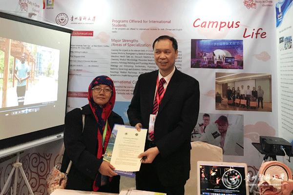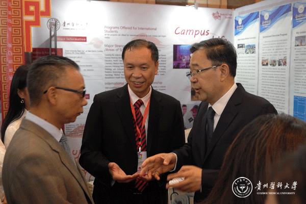 教育展上,孙志刚在我校展台驻留,亲切询问和关心学校医学教育发展情况。林昌虎详细介绍了现阶段学校医学国际教育及对外合作交流工作取得的经验和成果。孙志刚对我校此次展会宣传工作给予极大肯定和鼓励,并向徐步大使及娜达司长推荐介绍了我校,他指出:365足球动画直播是一所具有深厚历史文化底蕴的优秀医科大学,希望学校能发挥地方高等医学学府的自身优势,加强对外交流合作,创新国际医学教育模式,厚积薄发,再接再厉,为贵州经济社会发展作出更大的贡献。