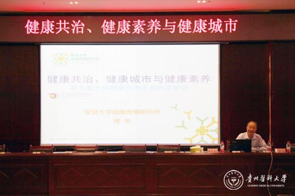 9月7日,复旦大学健康传播研究所所长傅华教授应邀到我校为广大师生作“健康共治、健康素养与健康城市”专题讲座。讲座在我校南校区道德讲堂进行,由我校副校长罗鹏主持。我校贵州省卫生发展研究院院长张爱华,公共卫生学院党委书记杨光红、院长洪峰,重点实验室副主任李军以及300余名师生聆听了讲座。