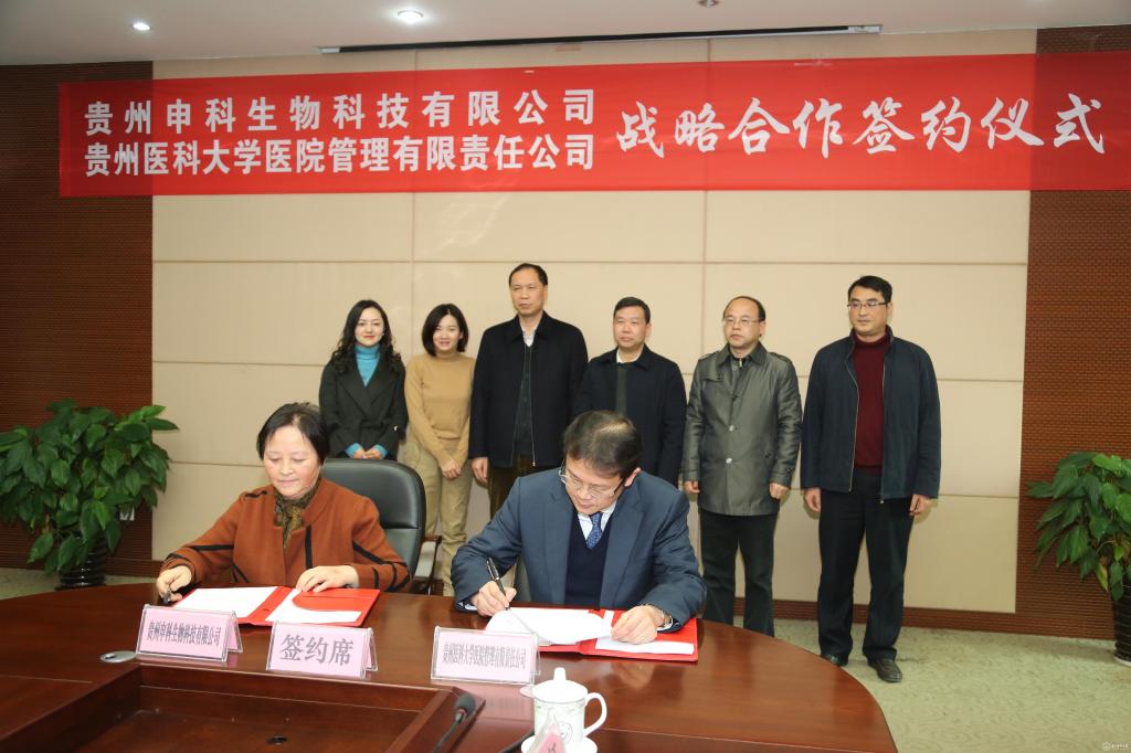 在出席签约仪式的领导、嘉宾的见证下,365足球动画直播医院管理有限责任公司总经理涂波与贵州申科生物科技有限公司董事长陈晓颖共同签署了战略合作协议。