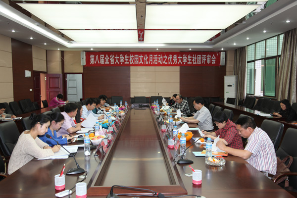 5月21日,第八届“多彩校园·闪亮青春”全省大学生校园文化活动月之“优秀大学生社团”评选活动在我校综合楼六楼连廊会议室举行。省委教育工委副书记、省教育厅党组成员方仕平,团省委副书记涂妍,省教育厅社政处处长鲁源安等到场指导工作,评选会由党委宣传部部长潘丽芬主持。全省37所高校的51个学生社团参加评选,评审专家由全省9所省直高校团委书记组成。本次评选活动得到学校党委大力支持,校领导高度重视,亲临现场指导工作。