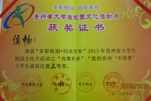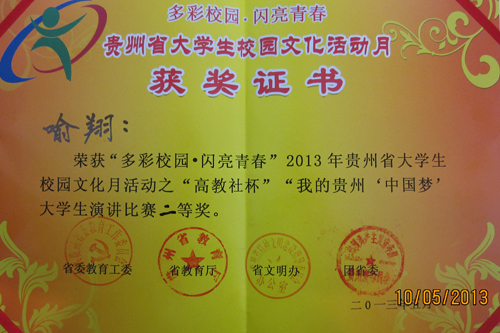 在“多彩贵州·闪亮青春”2013年贵州省大学生校园文化月活动之“高教社杯”“我的贵州‘中国梦’”大学生演讲比赛中,我校2012级研究生喻翔荣获二等奖,2012级卓越医师班侯畅荣获三等奖。