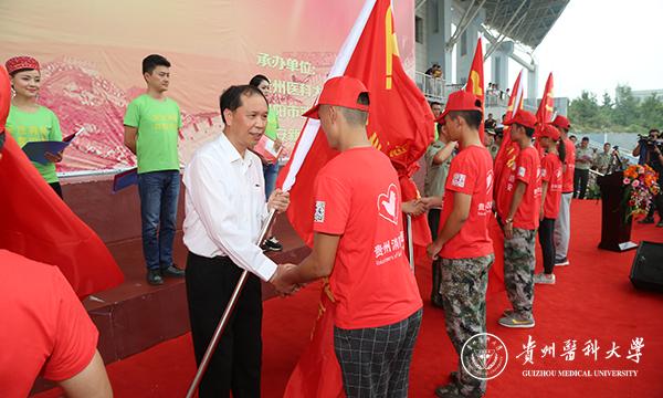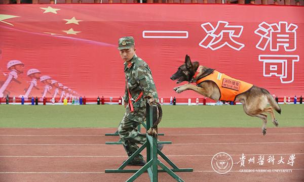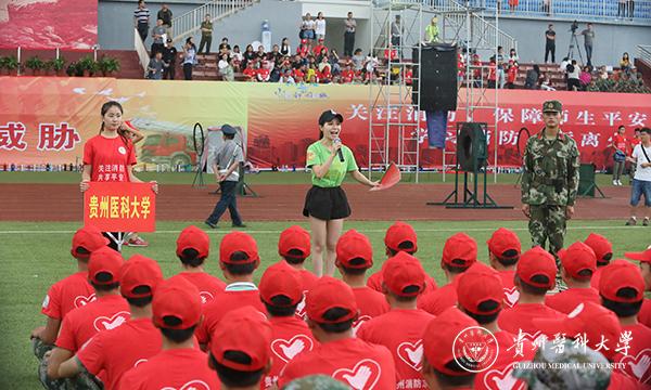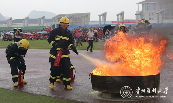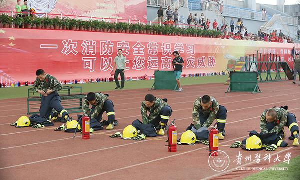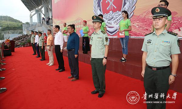 省教育厅党组成员、副厅长级督学杨勇,省消防总队江平总工程师,贵安新区大学城管委会罗松华主任,学校党委书记林昌虎、副校长冉江舟,消防部队官兵,贵州省消防宣传形象大使阿幼朵、景伟健,贵州广播电台“阳光952柳叶眉工作室”全体人员,贵州省九所高校的领导、老师、同学及我校五千余名师生在贵医齐聚,共同参加此次活动。整个活动分为消防志愿者宣誓、高校消防志愿者队伍授旗仪式、消防装备器材展示、消防搜救犬技能表演、现场消防知识抢答比赛、高校(校际)大学生消防技能大比武等环节;在场的参与者,特别是今年刚踏入大学校门的新生们不仅接受了一次消防安全知识教育,了解了安全工作的重要性,更近距离的接触体会到了战斗在一线消防官兵们的艰辛与不易。