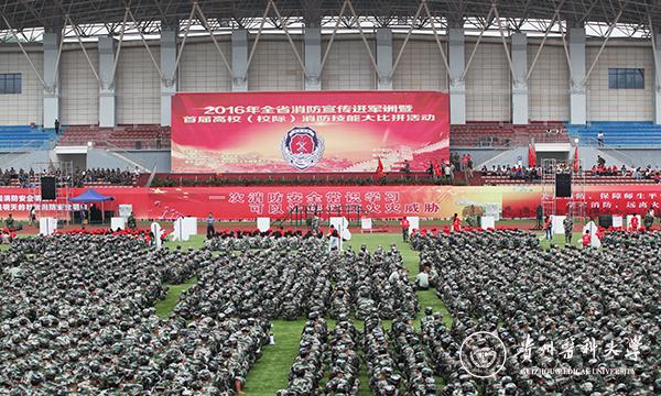 9月13日下午,由省教育厅、省军区司令部、省消防总队联合主办,贵安新区管委会、365足球动画直播、贵阳市消防支队、贵安新区消防支队承办的贵安新区大学城2016年全省消防宣传“进军训”暨首届高校(校际)消防技能大比拼活动在我校南校区体育场进行。